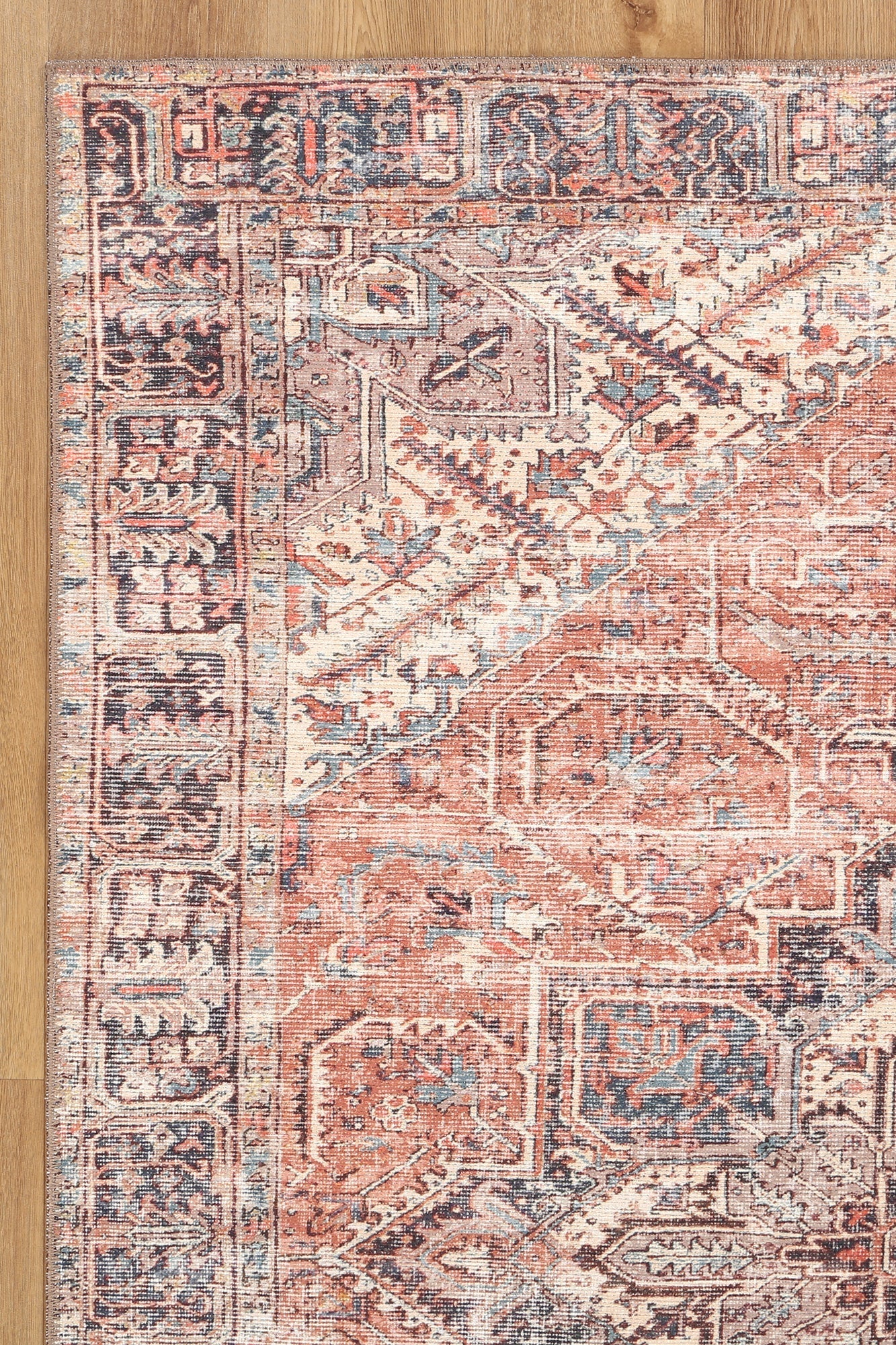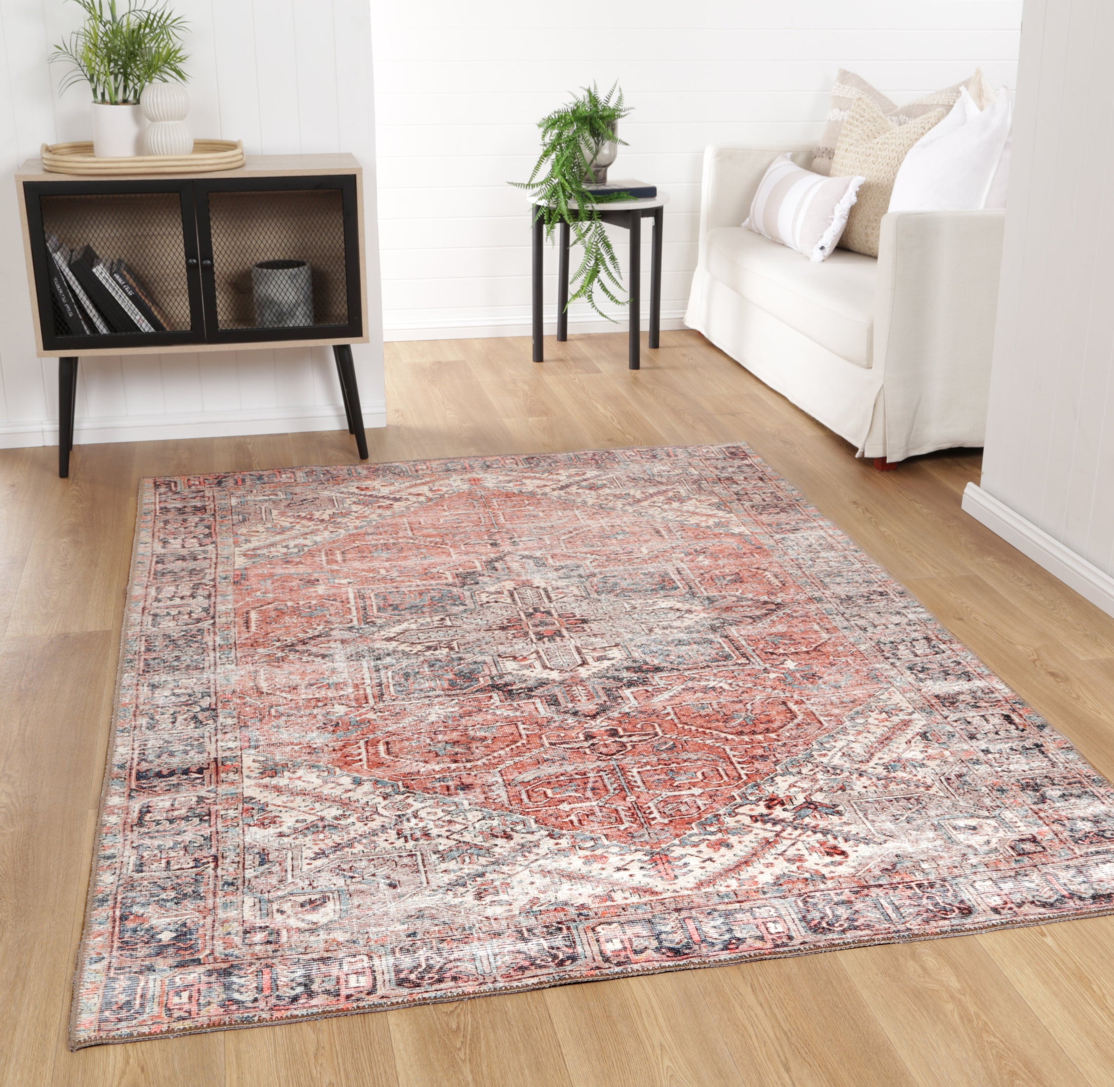 Transform your home with this Jezebel Washable rug. This classic design features terracotta and cream tones across the base and is reminiscent of traditional Turkish rugs. The intricate design includes a medallion in the center, while the vintage-inspired design has a beautifully distressed texture. Jezebel works well with farmhouse decor or can be used in more modern spaces. The colors hide spills and stains well so this is the perfect kitchen rug or dining room rug!