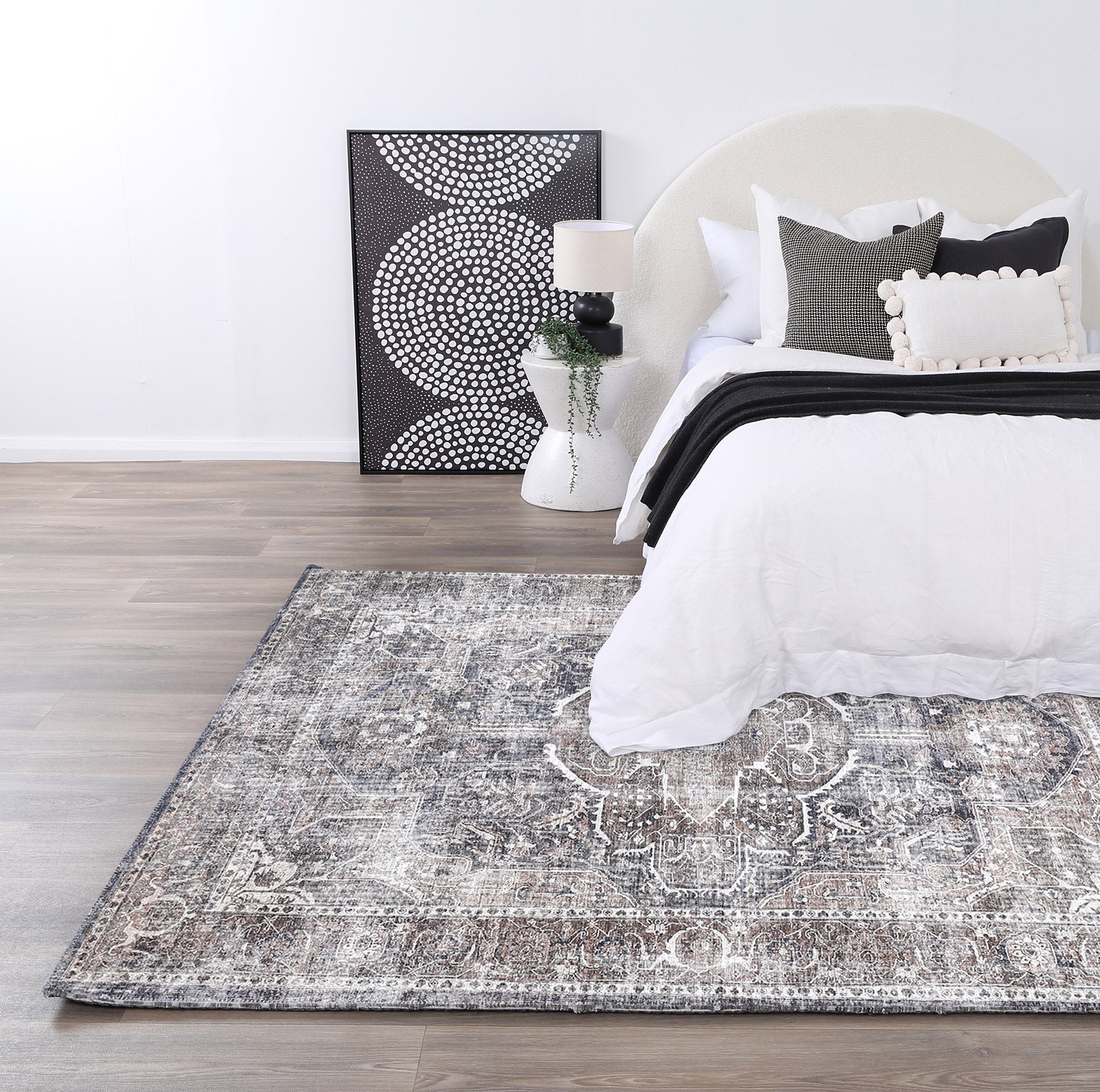 One of our top-sellers, the Kendra Ash is a chic beige and gray rug and is a great addition to any room in any home. This neutral rug is versatile and works well as a rug for an entryway, a bedroom rug or a living room area rug in both modern and traditional decor schemes. With a distressed oriental design, this washable rug has a distressed look that is both luxurious and homely.