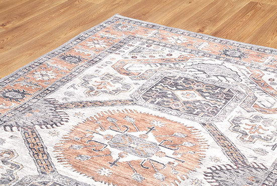 With its intricate design, this Oriental-inspired rug is perfect if you’re looking for something with modern a color palette and a traditional twist. The center medallion of the rug features trendy orange tones, which is then followed by an orange border surrounding the neutral center of oriental motifs in dark and grey hues. This is the perfect floor rug for an office or a living room!