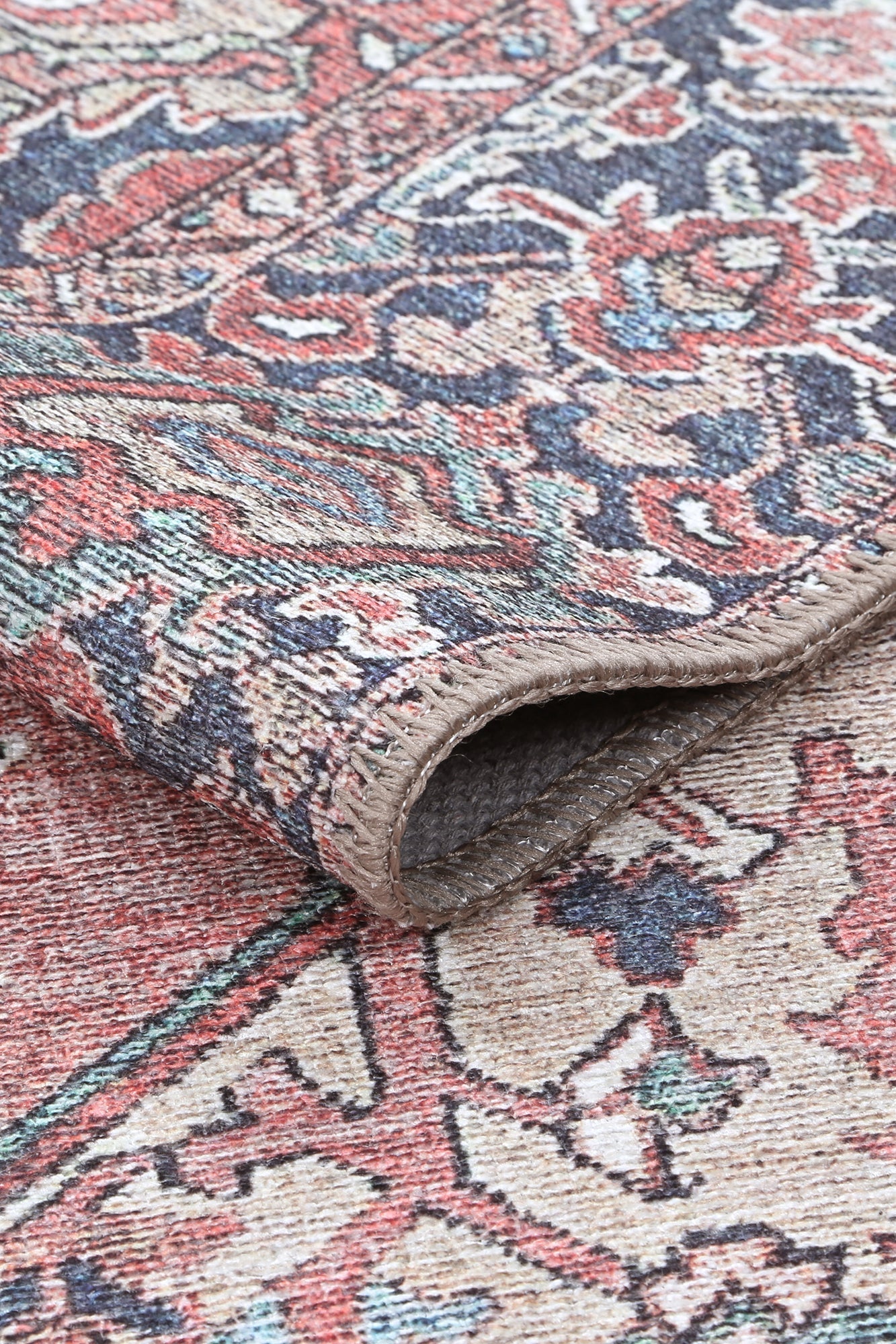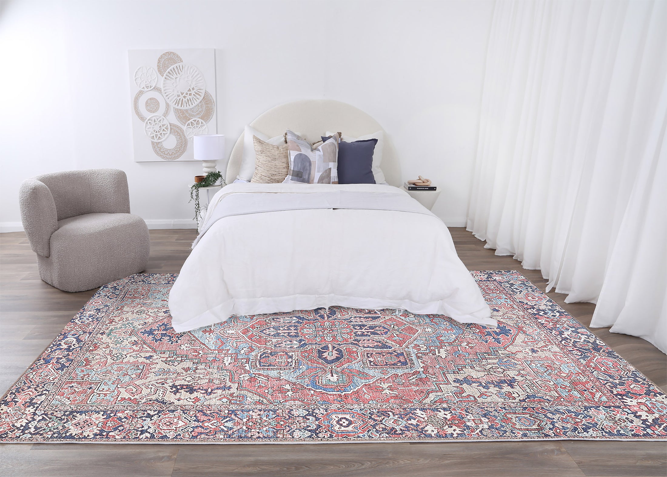 If a statement piece is needed to bring the wow factor to a home, then Colette is the perfect floor rug! This washable rug is made from 80% recycled cotton and features modern and bright colors with a distressed design. Featuring bold tones of reds and blues, it is versatile in contemporary decor and farmhouse decor. Blue rugs and red rugs make for great kitchen rugs, dining room rugs, and living room rugs.