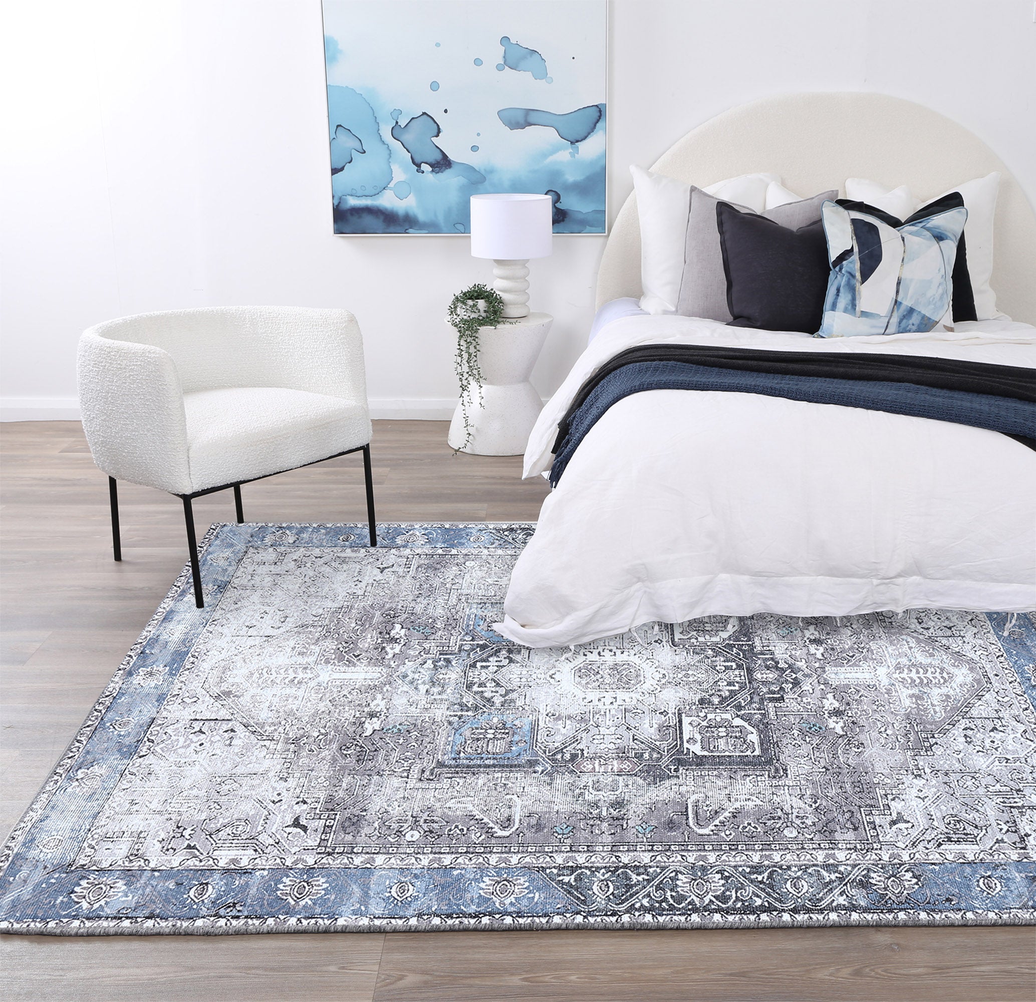 Adding a touch of class to any space is simple with our Odette oriental rug. Machine-made in Turkey, this washable rug features a distressed design in blue and gray tones. The Odette floor rug comes in a variety of sizes and is made for any room of the home - from a kitchen rug to a living room rug. The cool tones of this neutral rug add an elegant modern flair to classic home decor.